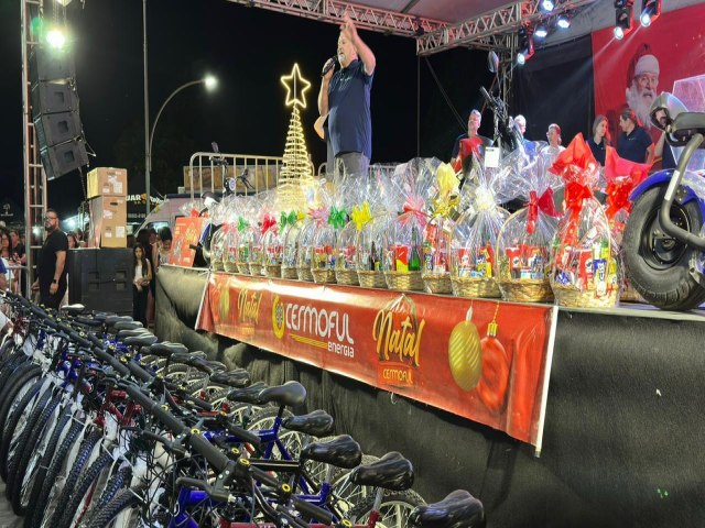 O sorteio integrou a programação do Natal Cermoful, na sexta-feira (05/12), ação que reuniu famílias em uma noite de apresentações artísticas e culturais. O evento ocorreu na praça Fridolino Schueroff e no Ginásio Municipal Nicolau Becker, com o sorteio de bicicletas e cestas natalinas, distribuição de bolas coloridas e balas.